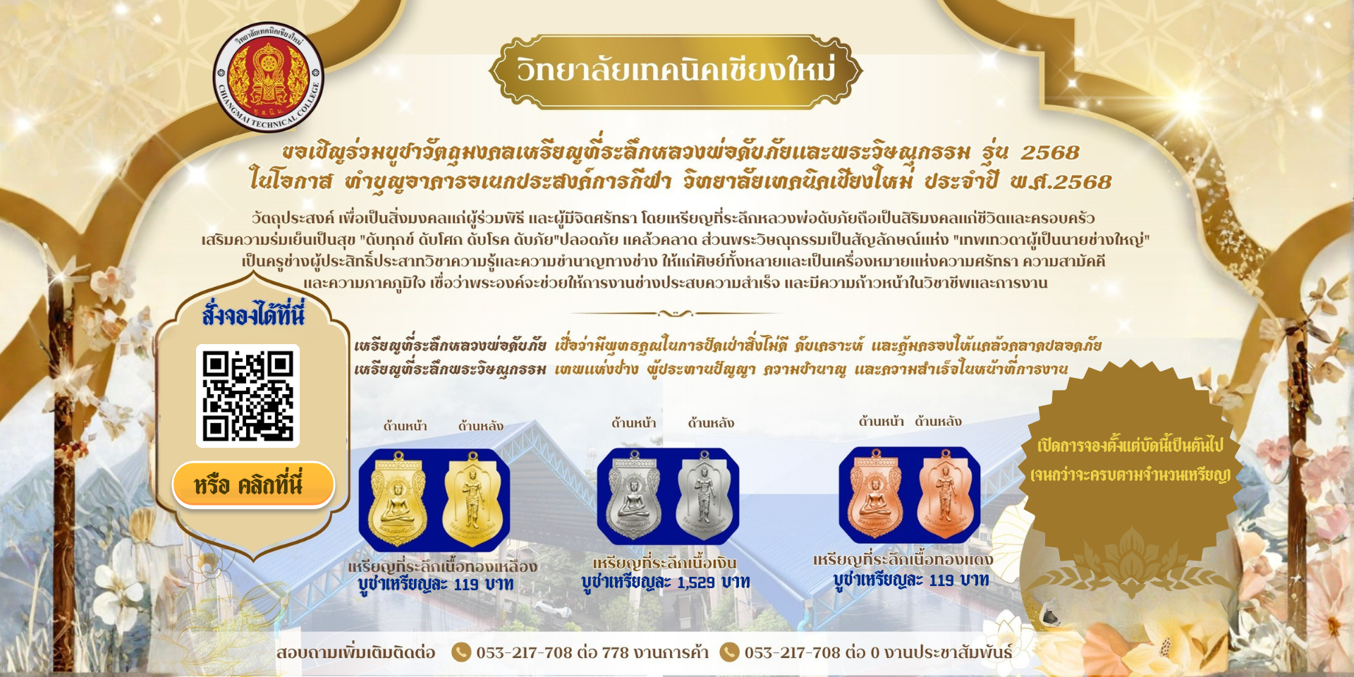 ขอเชิญร่วมบูชาวัตถุมงคลเหรียญที่ระลึกหลวงพ่อดับภัยและพระวิษณุกรรม รุ่น 2568 ในโอกาศ ทำบุญอาคารเอนกประสงค์การกีฬา วิทยาลัยเทคนิคเชียงใหม่ ประจำปี พ.ศ. 2568